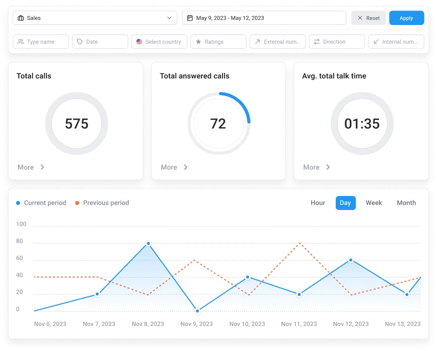 CloudTalk umożliwia firmom docieraj do klientów w sposób oparty na danych i realnych wskaźnikach. Real-time analytics oraz analiza centrum kontaktowego pozwalają na bieżąco oceniać skuteczność kampanii, wolumeny połączeń i zachowania klientów. Dane dostępne w czasie rzeczywistym umożliwiają natychmiastową reakcję na spadki efektywności, przeciążenia zespołu czy nieoptymalne ścieżki obsługi.