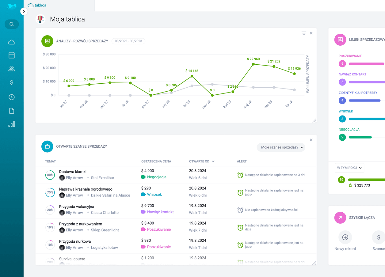 Z punktu widzenia menedżerów sprzedaży widok ogólny pełni funkcję centralnego panelu decyzyjnego, który pozwala szybko ocenić kondycję pipeline’u oraz dynamikę prowadzonych szans sprzedaży. Wszystkie kluczowe wskaźniki procesu sprzedaży są dostępne w jednym miejscu, co znacząco skraca czas potrzebny na analizę i umożliwia podejmowanie trafnych decyzji operacyjnych w oparciu o aktualne dane.